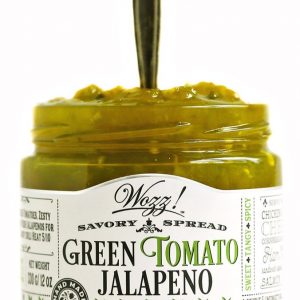 This Green Tomato Jalapeno Pepper Jelly Spread is sweet, spicy and tangy!  Garden picked green tomatoes, jalapenos and serrano chili peppers are sourced straight from the farm for a vibrant and medium spiced pepper jelly that is knock your socks off delicious!  Spoon over cream cheese and serve with crackers or serve alongside shake n bake pork chops or fried chicken for a flavorful kick.  Spread onto ham and turkey sandwiches for an alternative condiment with a tangy and spicy bite.